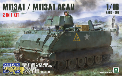 Plastikmodellbausatz im Maßstab 1:16 des US M113A1 / M113A1 ACAV - Armored Personnel Carrier - 2in1. Kann als M113A1 oder M113A1 ACAV gebaut werden.