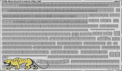 Fotogeätzte Reling für die Aufbauten der DKM Bismarck im Maßstab 1:200 von Trumpeter (03702). Das Set enthält eine Fotogeätzte Platine.