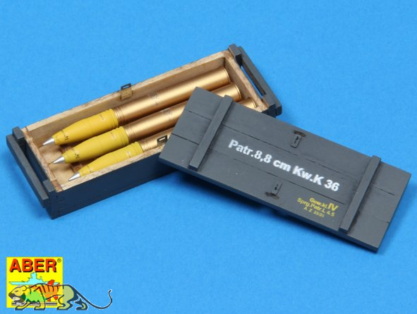 1/16 scale ABER Set of german High Explosive Ammo for the Tiger I with Ammo-Box. The set contains 3 High-Explosive rounds and one wooden box. Inclusive Decals and Photo-etched parts.