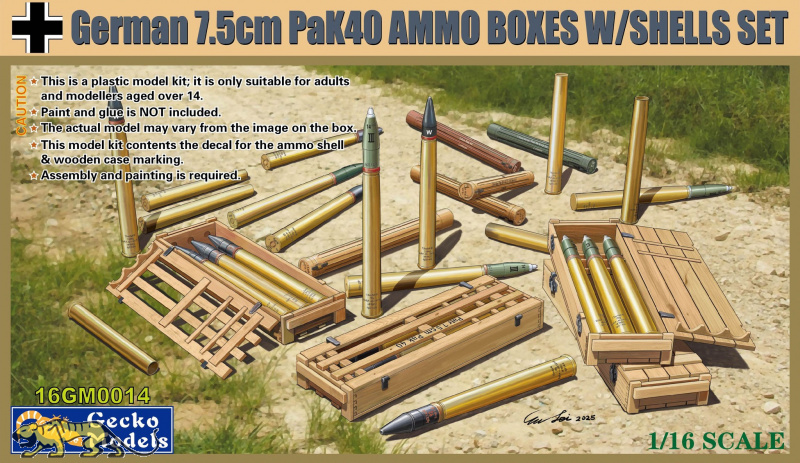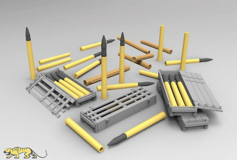 1/16 scale german 7,5 cm Pak 40 Ammo boxes with shells. The set contains two types of ammo boxes and two types of shells. Decals for the ammo shells and boxes are also included.