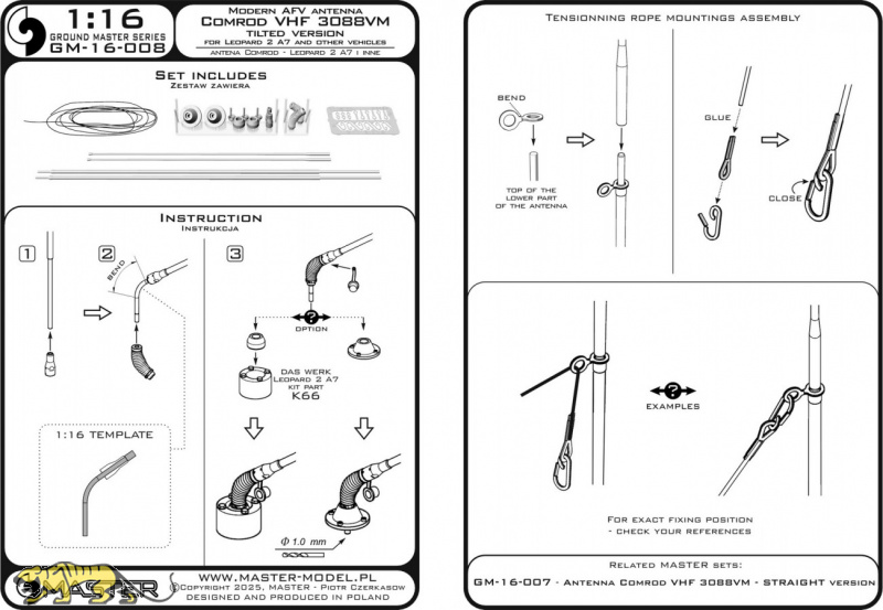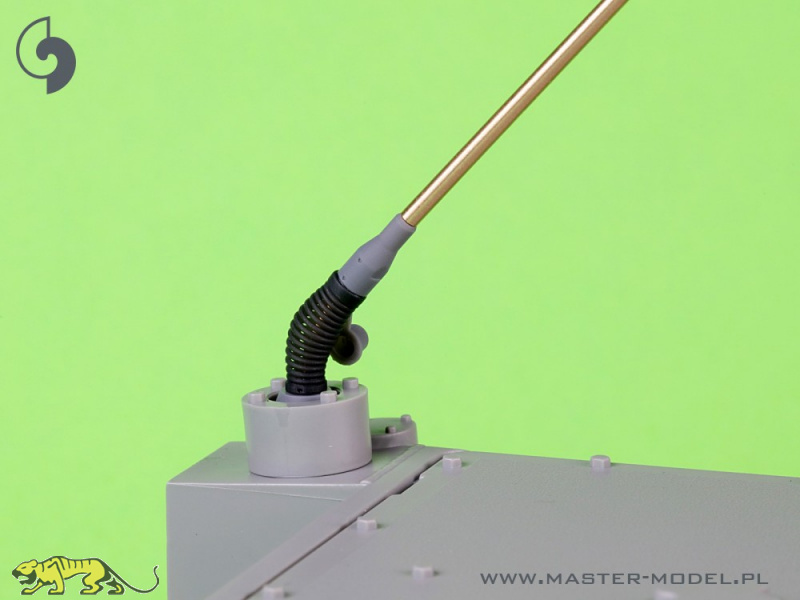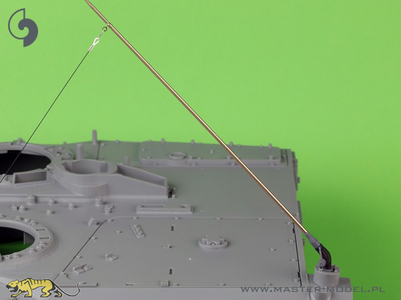 Set includes two Comrod VHF3088VM Antennas for the Leopard 2A7V and other vehicles - tilted version. Contains brass parts, photo-etched parts, wire and 3d printed resin parts.