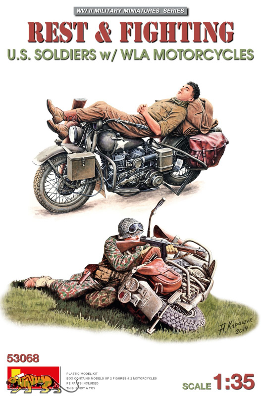 1/35 scale plastic model assembly kit - Rest & Fighting - US Soldiers with WLA Motorcycles. Set contains two figures and two motorcycles.
