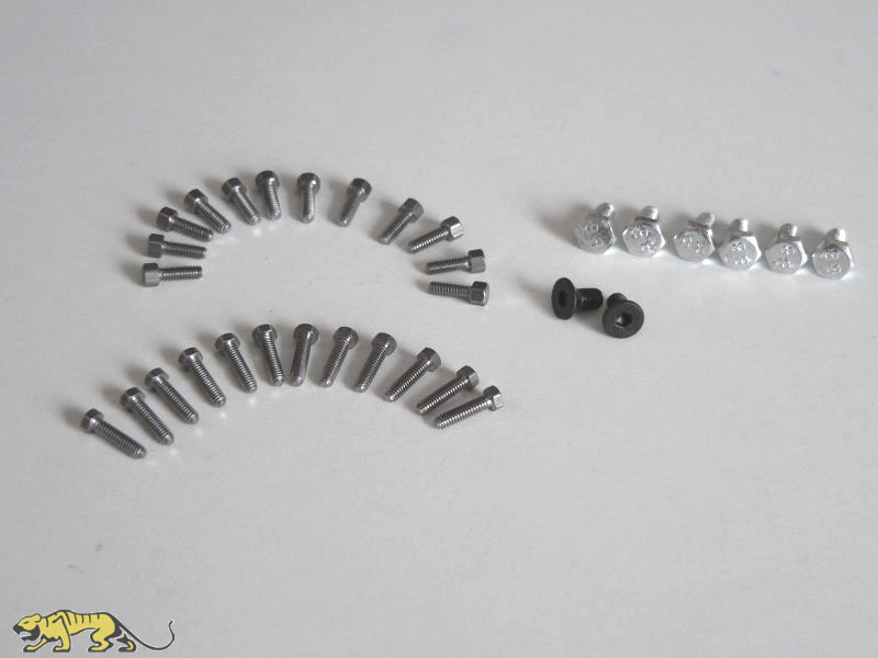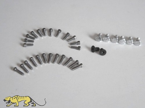 The set contains: 6 M3x6mm hexhead screws for the motors, replaces kit screws MA3; 2 M3x6mm allen-counter-skunk screws, replaces kit screws MC3; 12 M2 x 8mm hexhead screws with flat head, replaces kit screws MB3; 12 M2 x 6mm hexhead screws with high head, replaces kit screws MA4.