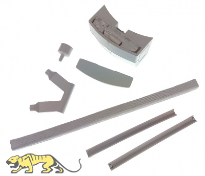 Conversion kit for the Tiger I in 1/16 scale, suitable for early production vehicles. This set is especially intended for early Tiger I tanks of the schwere Panzerabteilung 503. The kit includes a field-modified storage box, an engine deck intake cover without hoses, a field-made spare track link holder for the hull front, a log for self-recovery, and a funnel. Side mounting bracket for the storage box and U-clamps for the log must be scratch-built.