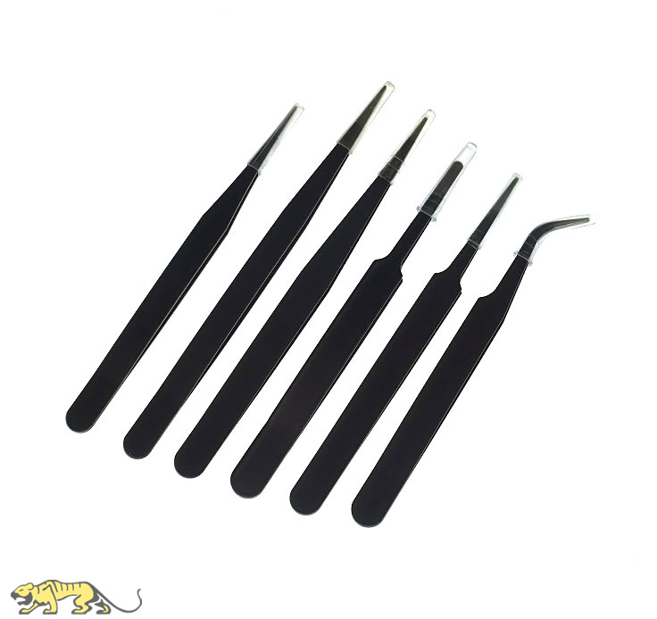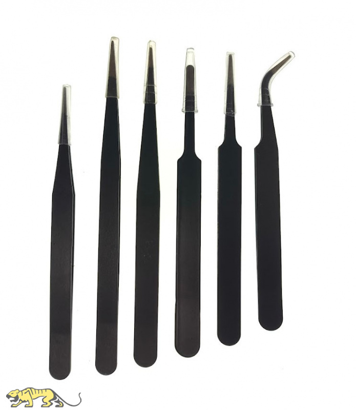 This basic tweezer set includes six tweezers with different tip shapes. Five feature straight tips in various sizes and lengths, including one with a wide, flat tip. The set is completed by a tweezer with angled tips – perfect for beginners. The tweezers are made from stainless steel.