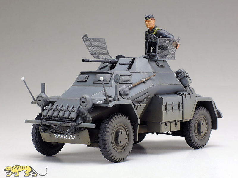 Throughout WWII, Germany carried out an extensive program of armored vehicle development, deploying a vast range of armored vehicles to the front line. Amongst these vehicles, the compact 4WD Sd.Kfz.222 remains one of the most famous and popular. Featuring welded plate armor particular to German vehicles at that time, the Sd.Kfz.222 was fitted with a rotating open top turret protected by grenade deflecting mesh screens. The 222 was equipped with an anti-tank and anti-aircraft 20mm main gun and a 7.92mm machine gun. Featuring a 4WD chassis with fully independent suspension and optional 4-wheel steering, it had a top speed of 90km/h. An exceptional off-road vehicle, the Sd.Kfz.222 was seen on all fronts throughout the middle phases of WWII.
