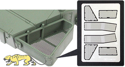 These photo etched parts for the 1/35 Scale Leopard 2 A5 and Leopard 2 A6 have been designed to more accurately reproduce the two storage buckets at the rear of the tank turret. Photo etched parts are to be used in place of the mesh netting supplied standard with kit. Made from stainless steel, these parts will not weather like standard brass photo etched parts. They also have been designed a lot thinner, allowing them to be easily wrapped around the bucket frame. Easy to use for an impressive look.