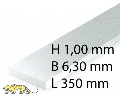 Der Beutel enthält 10 Polystrol-Streifen in den Abmessungen H 1,00 mm x B 6,30 mm x L 350 mm.