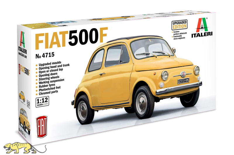 Plastikmodellbausatz im Maßstab 1:12 des legendären Fiat 500F - Überarbeitete Formen. Neue Türgriffe, neues Lenksystem.