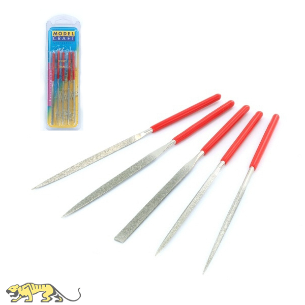 Set Diamant beschichtete Feilen in verschiedenen Formen, jede Feile ist 14cm lang und besitzt einen Kunststoffgriff. Ideal z.B. für die Bearbeitung von Fotoätzteilen. Länger haltbar und schneller schleifend als normale Schlüsselfeilen.