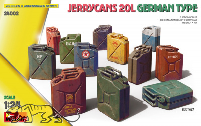 Plastikmodellbausatz im Maßstab 1:24 - Zubehör-Set - deutsche 20 Liter Benzinkanister. Set enthält 12 Benzinkanister, Fotoätzteile und Abziehbilder.