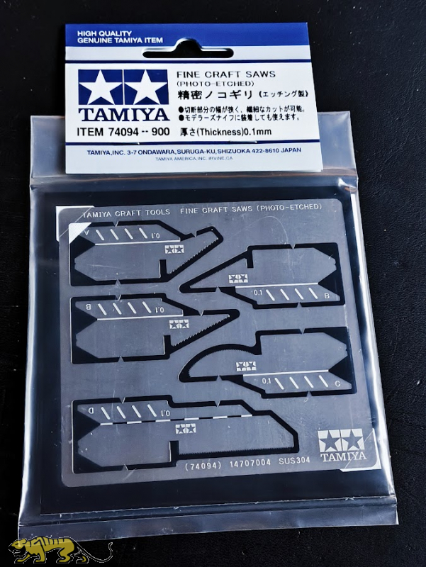 Das Set enthält 5 verschiedene Fotogeätzte Sägeblätter. Die Sägeblätter sind 0,1mm dick und werden zur Verstärkung gefaltet. Die Sägen können mit dem Tamiya Messer 74040 oder 74098 verwendet werden.